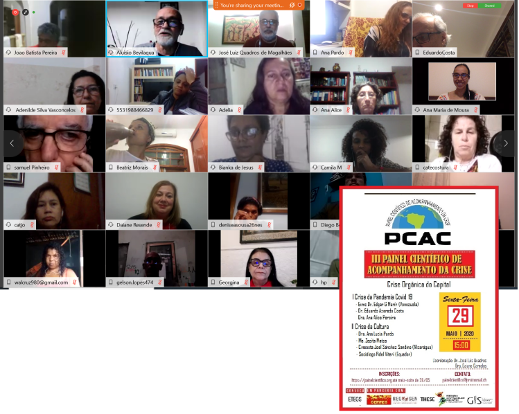 O terceiro encontro virtual do Painel Científico de Acompanhamento da Crise – PCAC se realizou no dia 29 de Maio de 2020 e foi dividido em dois momentos, nos quais foram abordados (I) a Crise da Pandemia Covid-19 e (II) a Crise da Cultura, como expressões da Crise Orgânica do Capital em diferentes esferas da vida social, oferecendo assim uma perspectiva inter- e transdisciplinar que enriquece a compreensão da atual conjuntura.